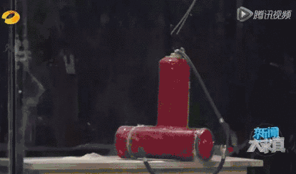 绳子另一端绑着的灭火器直接摔倒在桌上